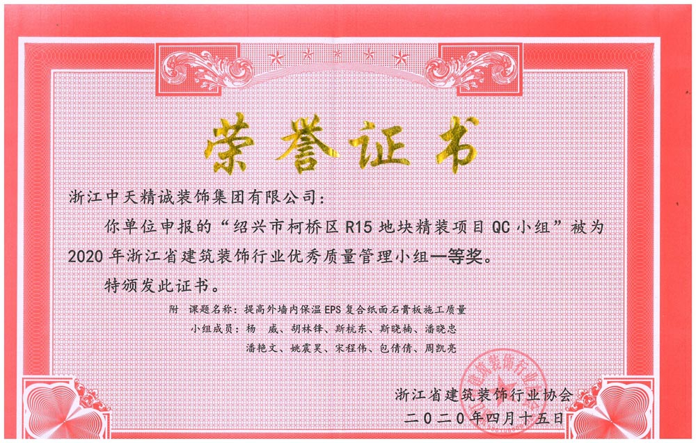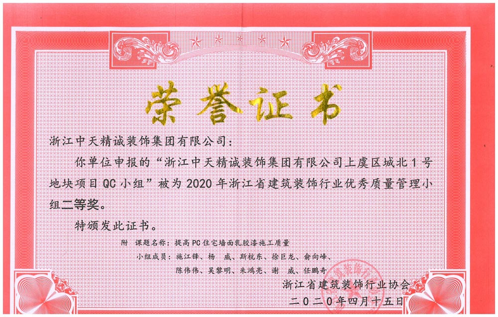 近日,浙江省建筑裝飾行業(yè)協(xié)會(huì)公布2020年浙江省建筑裝飾行業(yè)質(zhì)量管理小組活動(dòng)成果,經(jīng)協(xié)會(huì)初審及專(zhuān)家委員會(huì)綜合評(píng)審,中天精誠(chéng)裝飾三項(xiàng)QC成果獲獎(jiǎng)。