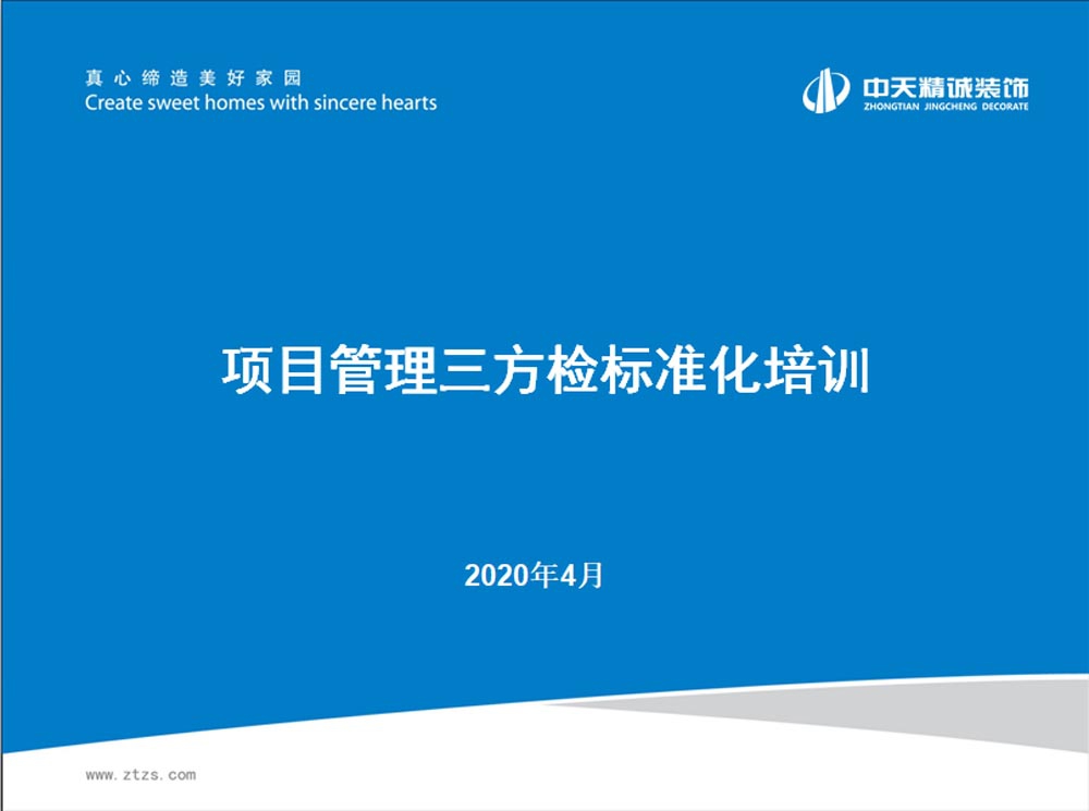 為進一步提升大客戶“三方檢”成績,提升客戶滿意度,4月28日下午,中天精誠裝飾在會議室召開“三方檢”管理培訓,精誠裝飾項目管理中心、分公司、項目部等與三方檢相關人員參加本次會議。會議由項目管理中心副經理張靈傳主持,分公司及項目部采用視頻會議形式參加。