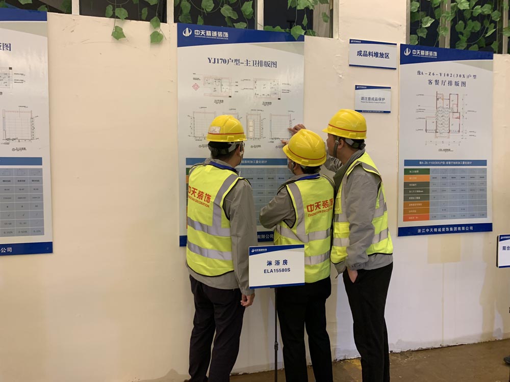 與會人員在精誠裝飾二分公司經理陳新德的帶領下,現場觀摩了碧桂園天琴苑項目的集中加工區、土建移交區和樣板交付區,詳細了解了加工區的場地布置、機械配置、圖紙排版、下單配送等集中加工關鍵環節。天琴苑項目部執行經理鐘榮恒對集中加工現場管理、高效配送、如何優化降低瓷磚損耗率等方面進行重點講解,同時就一戶一表驗收、樣板交付等做分享交流。