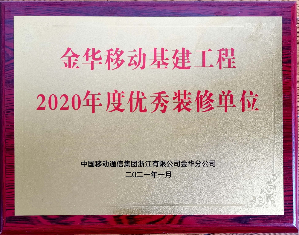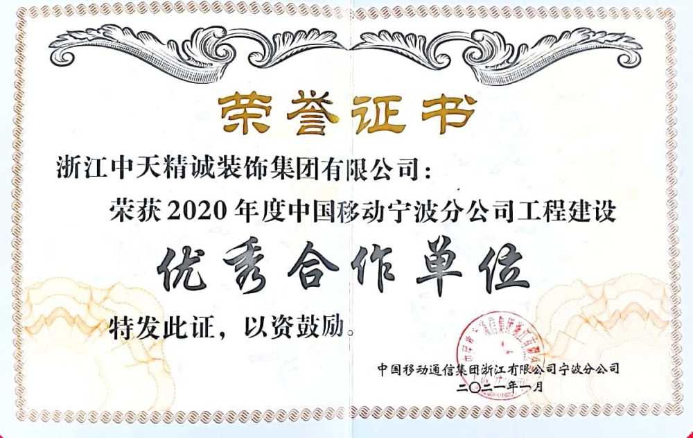近日,中天精誠裝飾榮獲中國移動寧波分公司2020年度“優秀合作單位”、中國移動金華分公司2020年度“優秀裝修單位”。