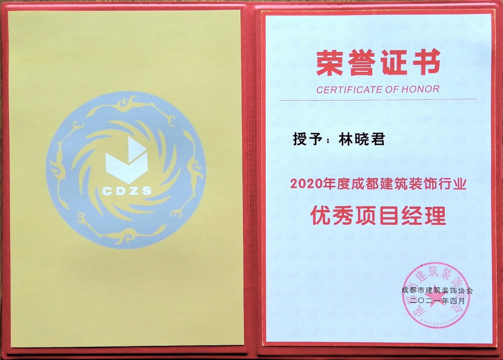 2021年4月,中天精誠裝飾榮獲成都建筑裝飾協(xié)會“2020年度成都建筑裝飾行業(yè)先進企業(yè)”榮譽稱號。項目經(jīng)理沈濟紅、林曉君兩人榮獲“2020年度成都建筑裝飾行業(yè)優(yōu)秀項目經(jīng)理”稱號。