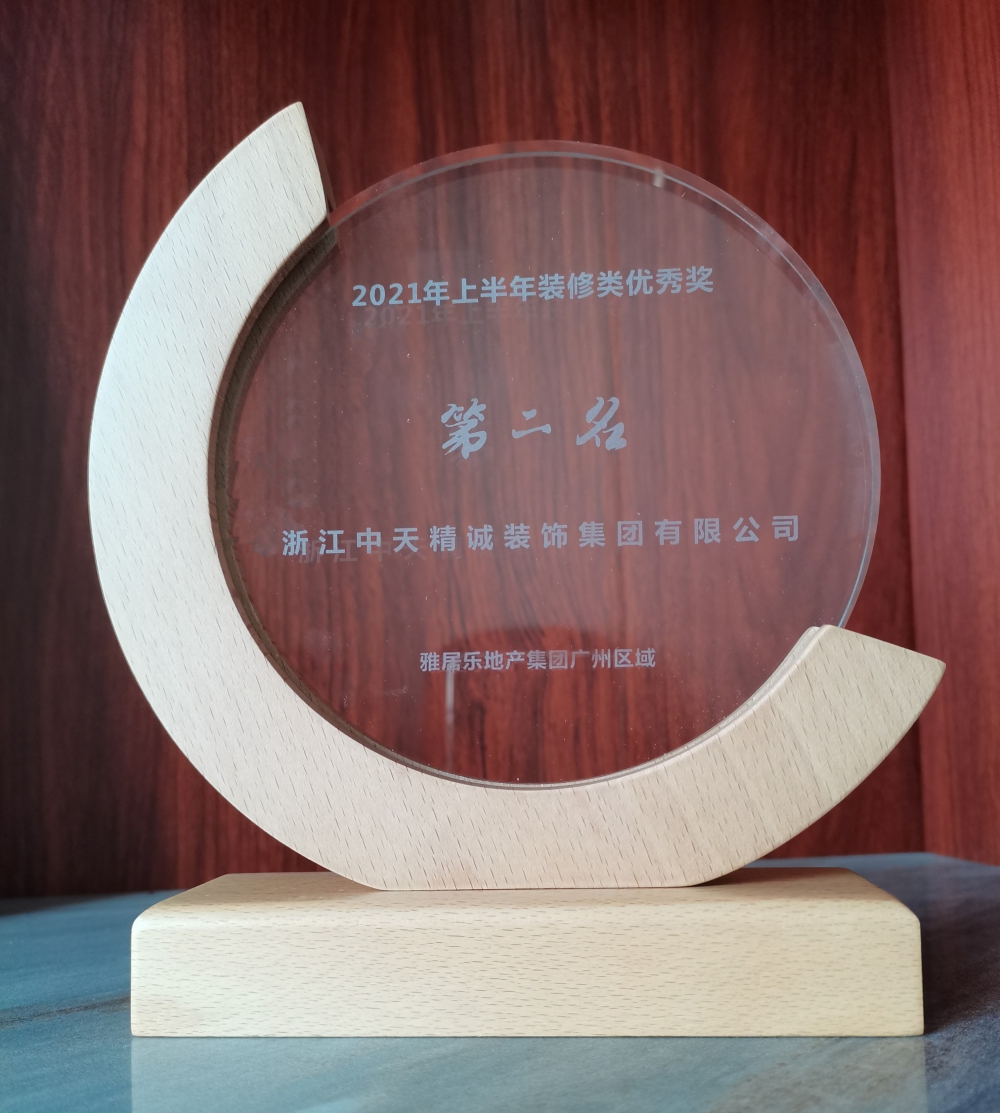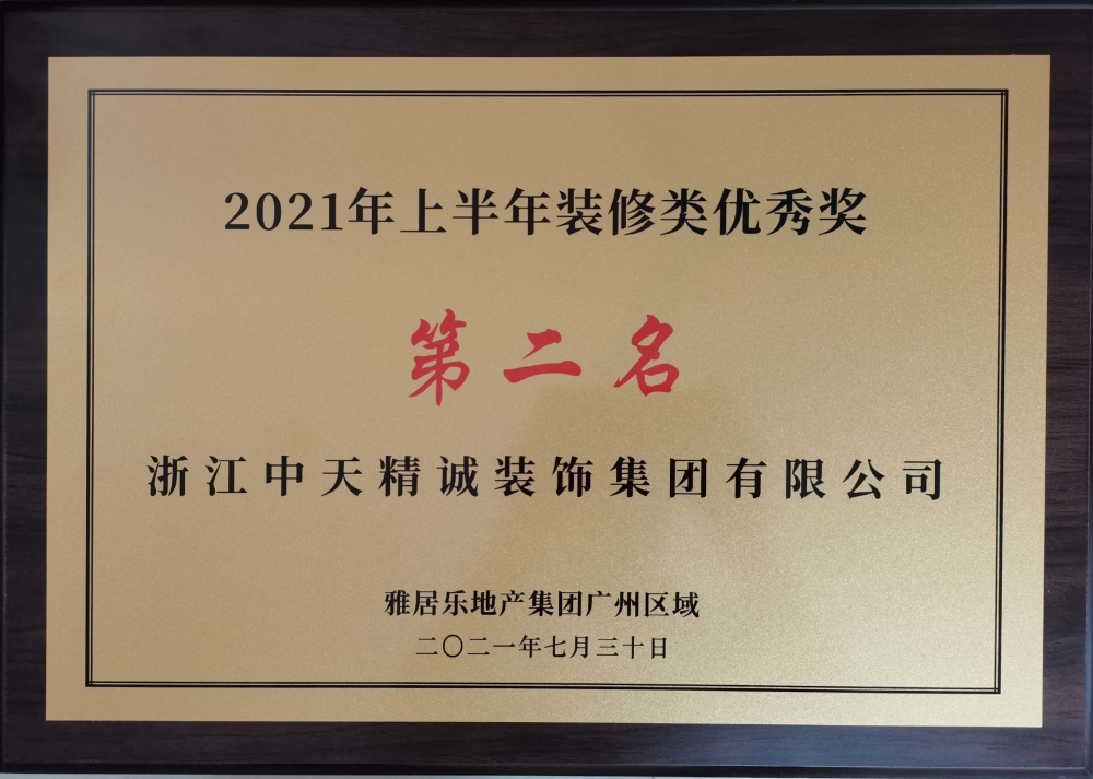 近日,中天精誠裝飾榮獲雅居樂地產(chǎn)集團(tuán)廣州區(qū)域2021年上半年裝修類優(yōu)秀獎第二名。