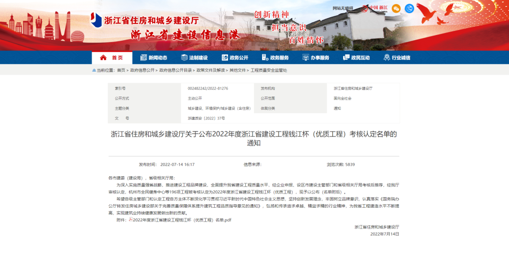 近日,浙江省住房和城鄉(xiāng)建設(shè)廳發(fā)布了《關(guān)于公布2022年度浙江省建設(shè)工程錢(qián)江杯(優(yōu)質(zhì)工程)考核認(rèn)定名單的通知》,196項(xiàng)工程被考核認(rèn)定為2022年度浙江省建設(shè)工程錢(qián)江杯(優(yōu)質(zhì)工程)。中天精誠(chéng)裝飾參建的浙江醫(yī)藥股份有限公司質(zhì)檢系列車(chē)間項(xiàng)目獲此榮譽(yù)稱(chēng)號(hào)。