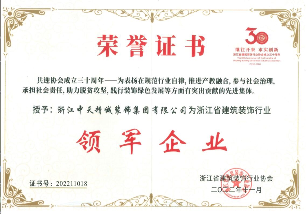 大會對在規范行業自律,推進產教融合,參與社會治理,承擔社會責任,助力脫貧攻堅,踐行裝飾綠色發展等方面有突出貢獻的先進集體進行了表彰。中天精誠裝飾獲“浙江省建筑裝飾行業領軍企業”稱號。隨后,大會選舉產生了協會第七屆理事會成員,中天精誠裝飾總經理斯杭東任協會副會長。
