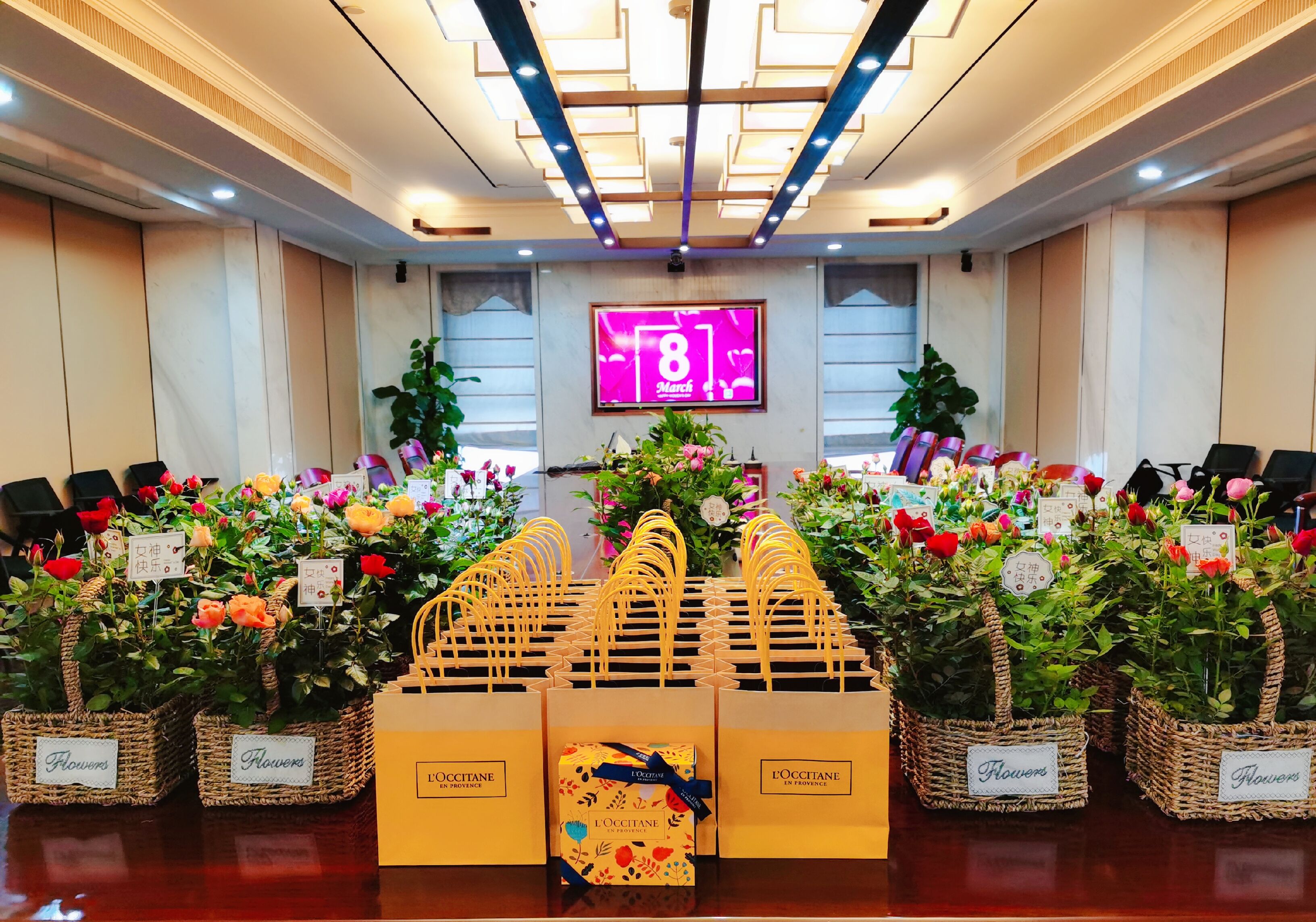 在希臘神話中,玫瑰既是美神的化身,又溶進了愛神的鮮血,它集愛與美于一身,女神節,送玫瑰花,最合適不過了。3月8日,在這個專屬女人的節日里,中天精誠裝飾董事長斯杭東、總經理楊威、副總經理兼工會主席潘曉忠為女神們送上嬌艷欲滴的玫瑰花和護膚套裝,希望女神們在工作之余能從頭到腳奢享精致護理,駐守美麗的容顏,并代表公司祝各位女神節日快樂!